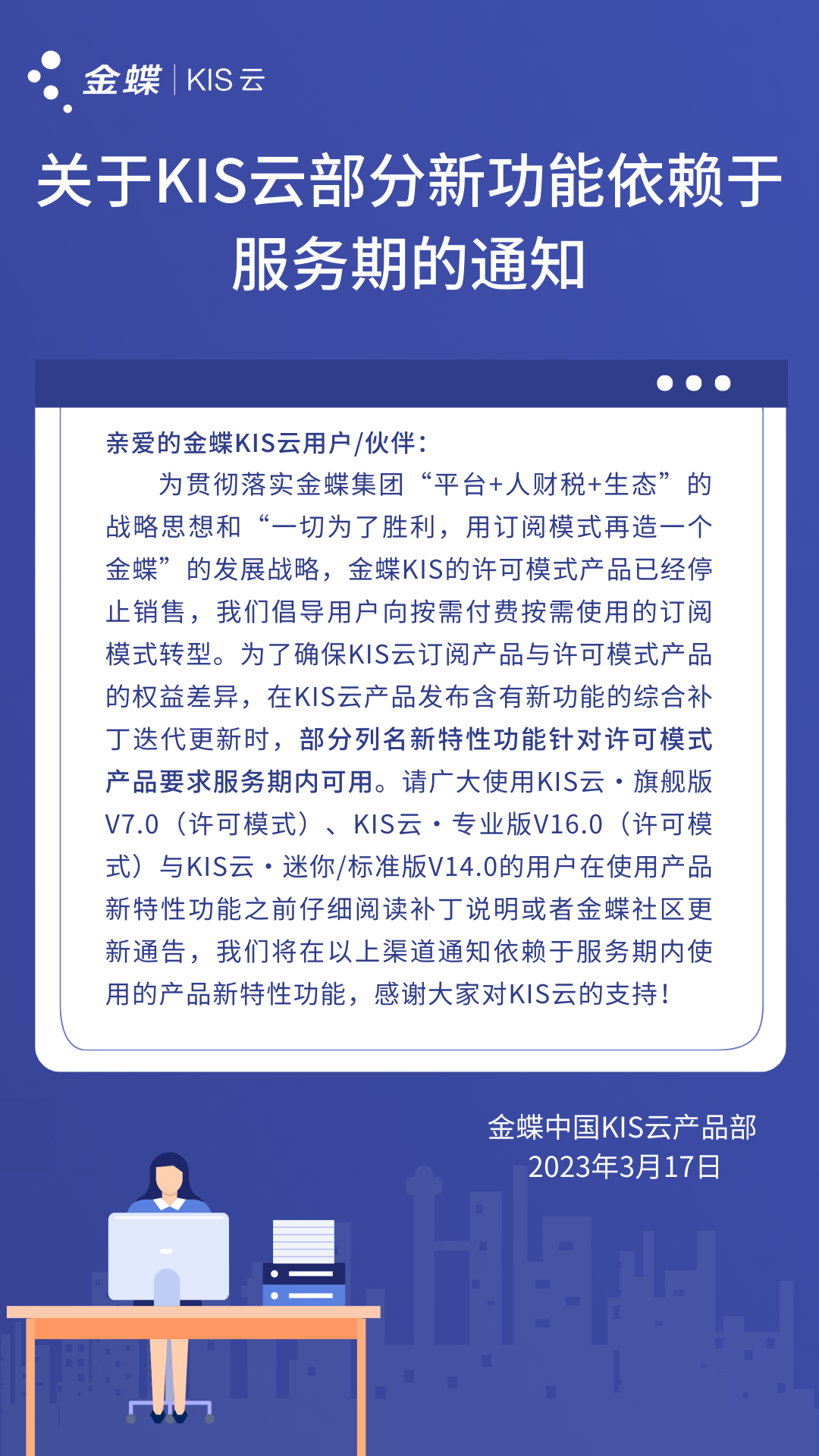 洛陽(yáng)金蝶軟件-2023.3.17關(guān)于 金蝶KIS 云部分新功能依賴于服務(wù)期的通知