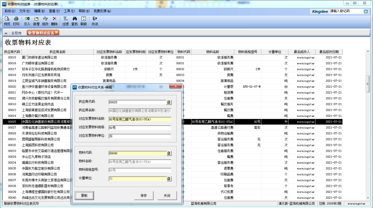 △ 收票物料對應(yīng)表界面