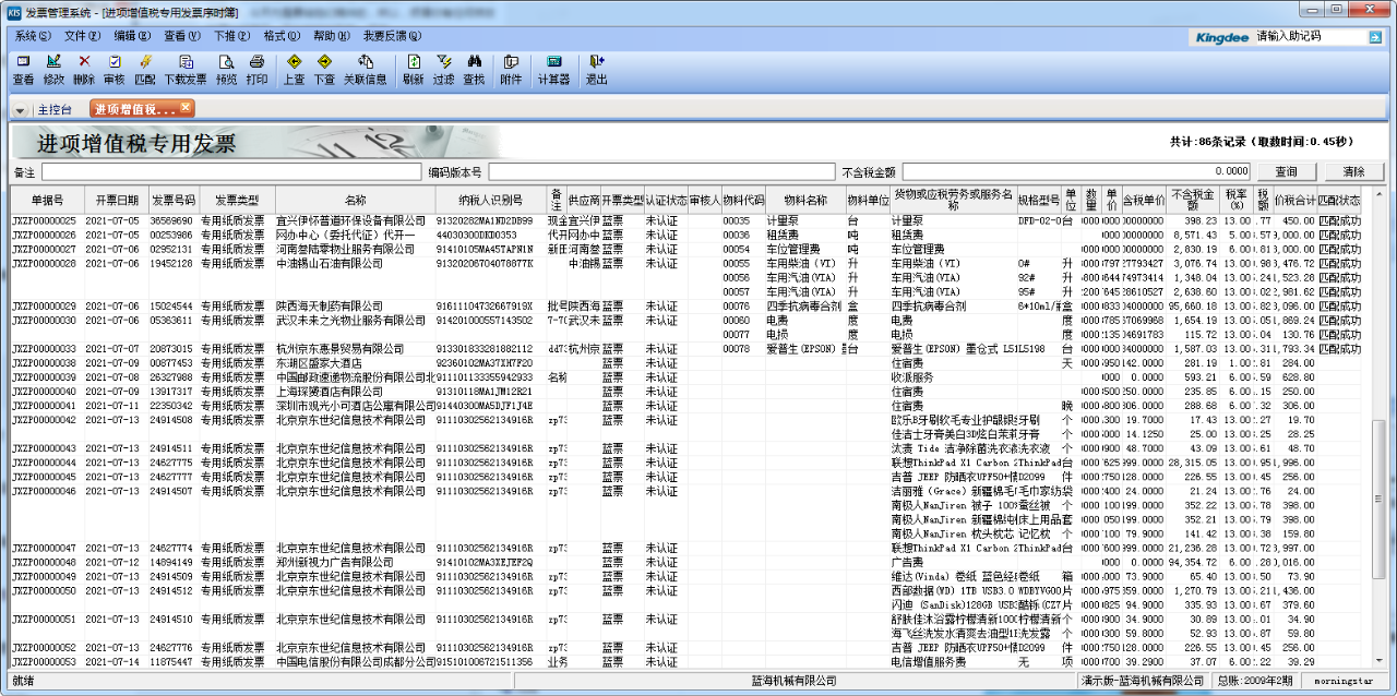 如果完成了前面兩個步驟,用戶就可以進(jìn)入「進(jìn)項增值稅發(fā)票」界面下載發(fā)票,一鍵匹配供應(yīng)商、物料、計量單位等信息,下推即可生成外購入庫單、采購發(fā)票單據(jù)。