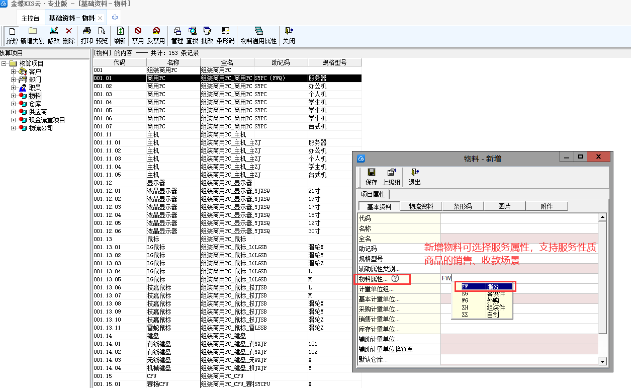 1、物料屬性增加“服務(wù)”,支持服務(wù)性質(zhì)商品的銷售、收款場景