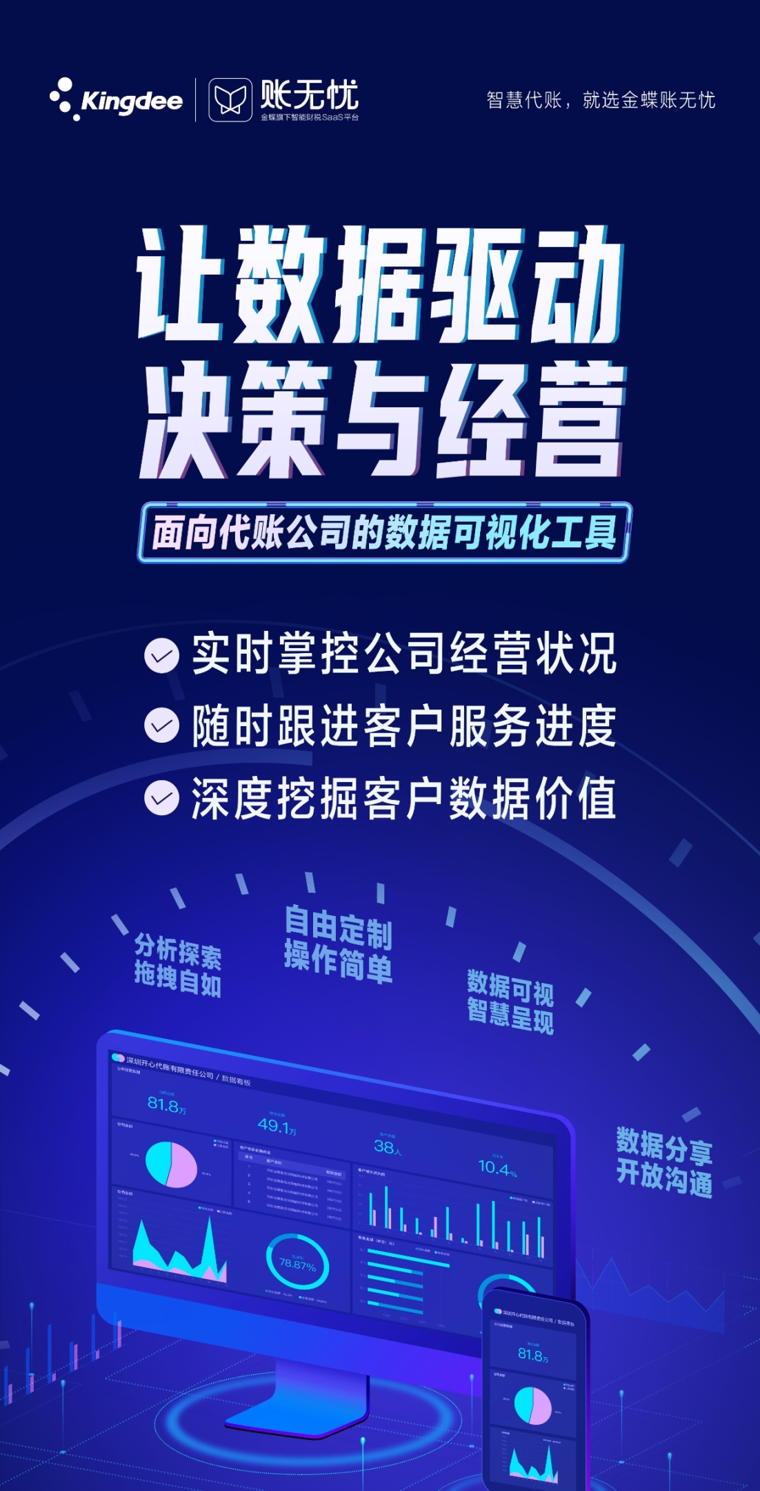 圍繞客戶業(yè)務(wù)場景需求,不斷研發(fā)新技術(shù)以優(yōu)化產(chǎn)品服務(wù)、打造客戶極致體驗(yàn)是金蝶賬無憂的堅(jiān)持。財(cái)稅服務(wù)市場正從增量轉(zhuǎn)為存量,不少代賬公司遇到業(yè)務(wù)增長瓶頸,金蝶賬無憂隨即推出 “數(shù)字駕駛艙”新解決方案,依托大數(shù)據(jù),為代賬公司提升企業(yè)運(yùn)營效率、打造數(shù)字化服務(wù)體系、挖掘增值服務(wù)增長點(diǎn)、激活員工并全員驅(qū)動(dòng),以數(shù)字化模式創(chuàng)新助推代賬公司數(shù)字戰(zhàn)斗力即核心競爭力的打造。