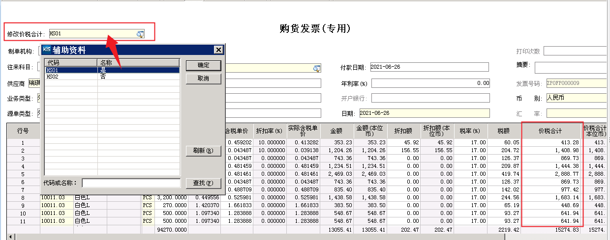 ▲ 購(gòu)貨發(fā)票(專用)-修改價(jià)稅合計(jì)
