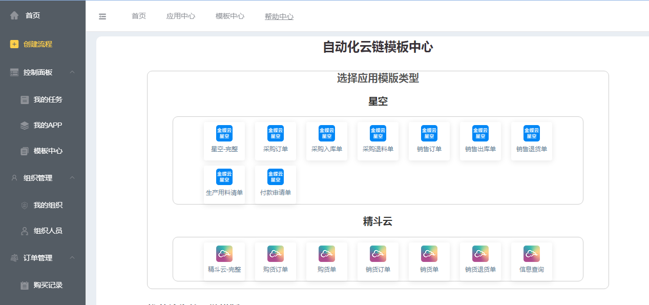 2、進入【應(yīng)用中心】選擇應(yīng)用【精斗云云會計】,在進入后的界面選擇對應(yīng)的執(zhí)行動作【服務(wù)到期提醒】,按操作提示依次操作授權(quán)賬號,選擇賬套ID,設(shè)置服務(wù)到期前的天數(shù),即完成精斗云云會計的配置