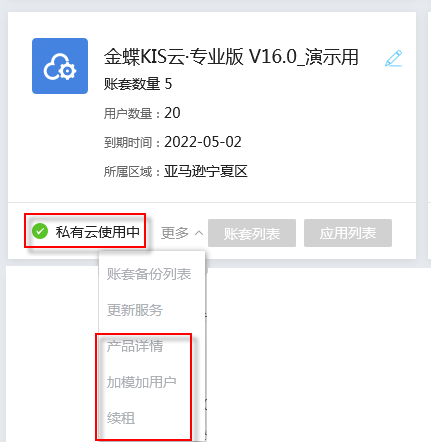金蝶KIS云管理中心支持私有云加模和加用戶、續(xù)費(fèi)用。