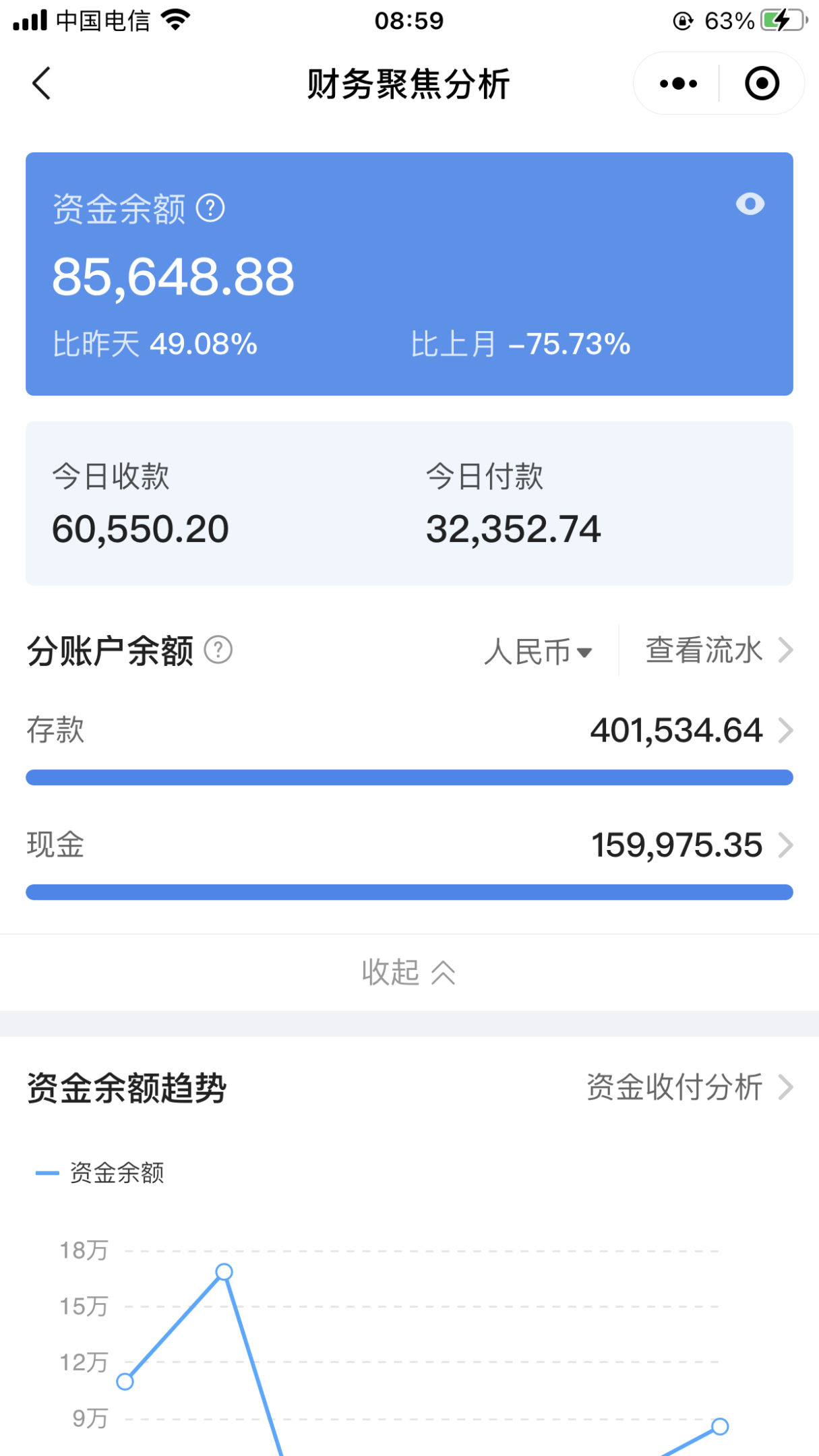 使用金蝶云·星辰后,英姐在微信上打開“老板參謀”小程序,就可以直觀的看到企業(yè)的資金余額和利潤分析,能實時了解企業(yè)資金的流向,每個賬號還剩多少錢,每個賬戶的流水明細(xì)情況,同時能對企業(yè)未來的資金情況進(jìn)行預(yù)測。