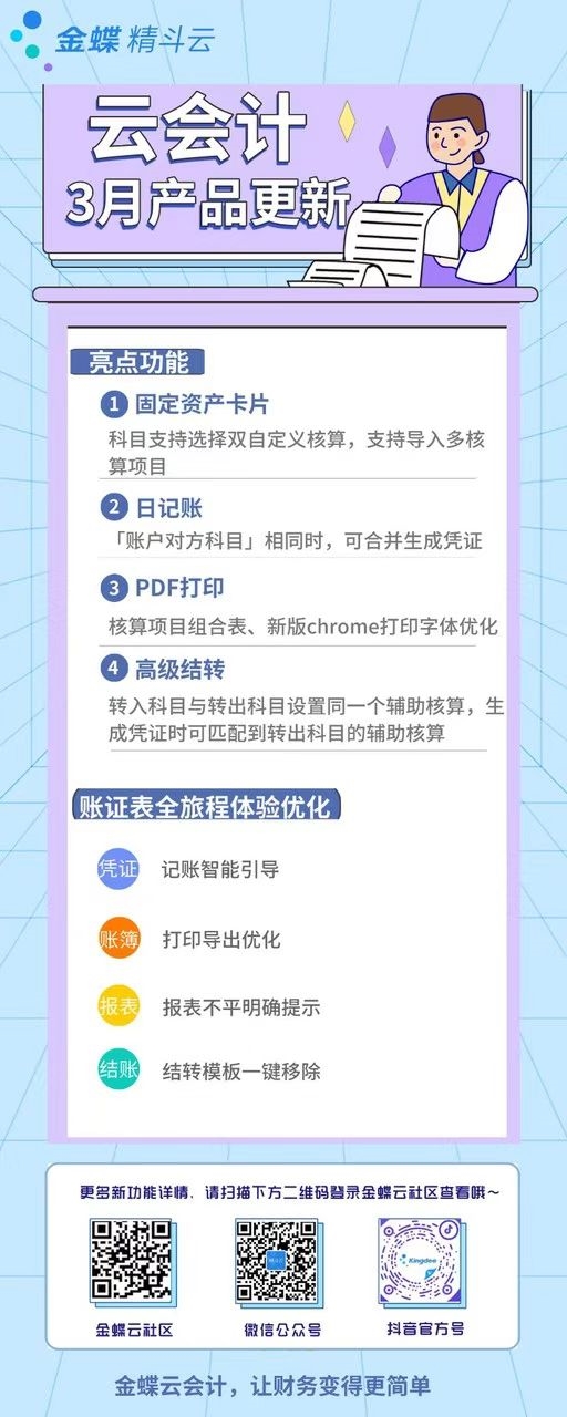金蝶精斗云·云會計3月產(chǎn)品新特性快來看看您的需求更新了嗎?具體更新功能如下圖 海報: