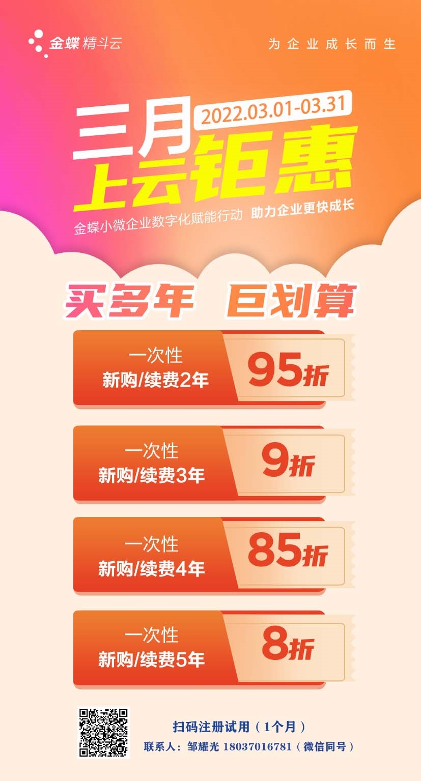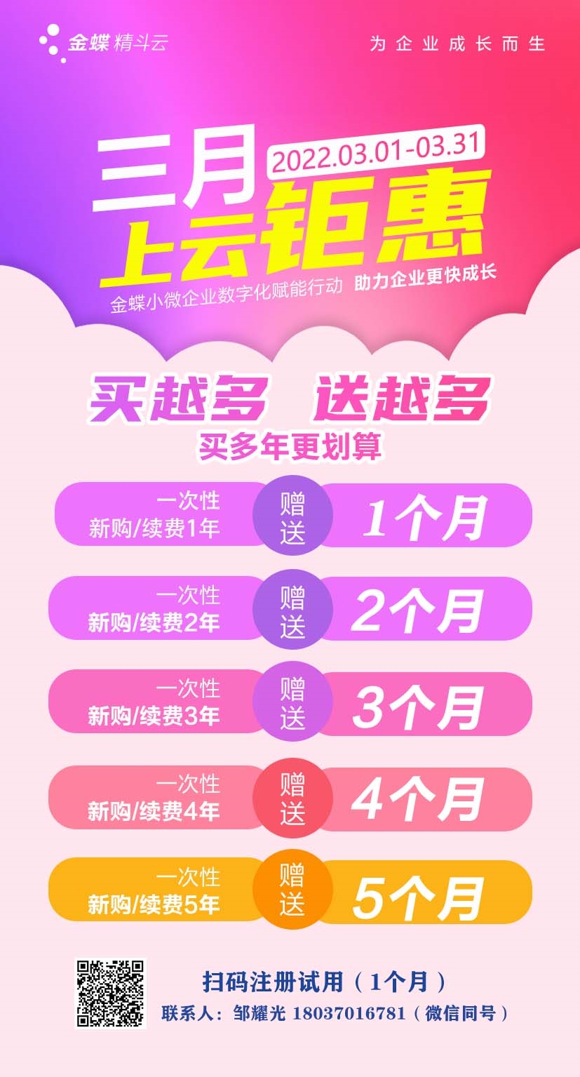金蝶-云會計2022.3月開通購買 優(yōu)惠政策如下: