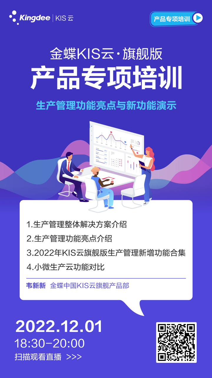 可通過(guò)掃描海報(bào)二維碼預(yù)約觀看直播 KIS云·旗艦版生產(chǎn)管理功能亮點(diǎn)與新功能介紹