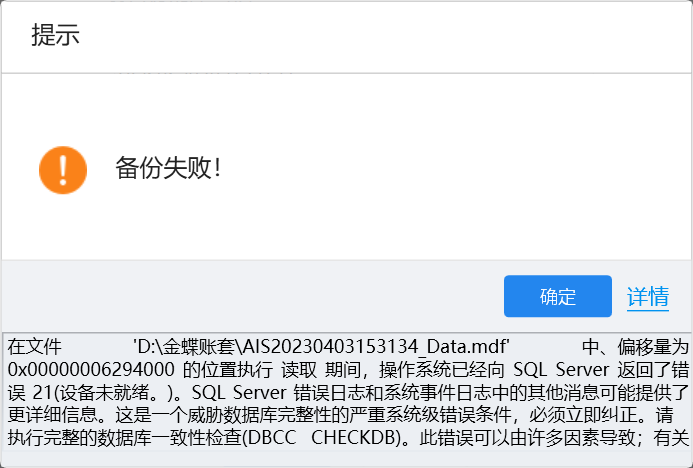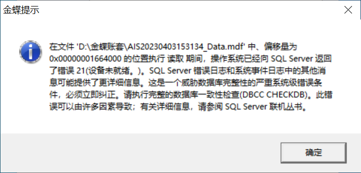 在文件'D:\金蝶賬套實體文件AIS20220812113211_Data.mdf中、偏移量為0x00000000532000的位置執(zhí)行讀取期間,操作系統(tǒng)已經(jīng)向SQL Server返回了錯誤21(設(shè)備未就緒。)。SQL Server錯誤日志和系統(tǒng)事件日志中的其他消息可能提供了更詳細(xì)信息。這是一個威脅數(shù)據(jù)庫完整性的嚴(yán)重系統(tǒng)級錯誤條件,必須立即糾正。請執(zhí)行完整的數(shù)據(jù)庫一致性檢查(DBCC CHECKDB)。此錯誤可以由許多因素導(dǎo)致;有關(guān)詳細(xì)信息,請參閱SQL Server聯(lián)機(jī)叢書。