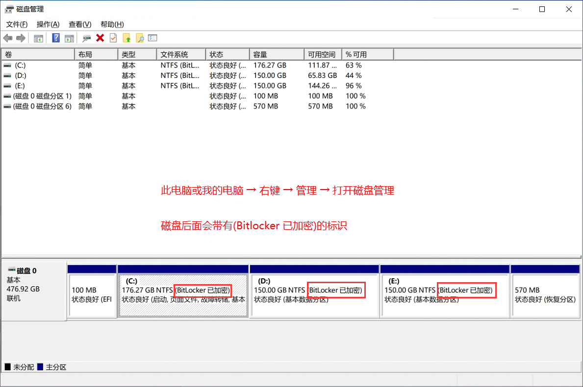 注意:關(guān)閉設(shè)備加密功能后,磁盤管理中C盤也不在提示Bitlocker已加密。