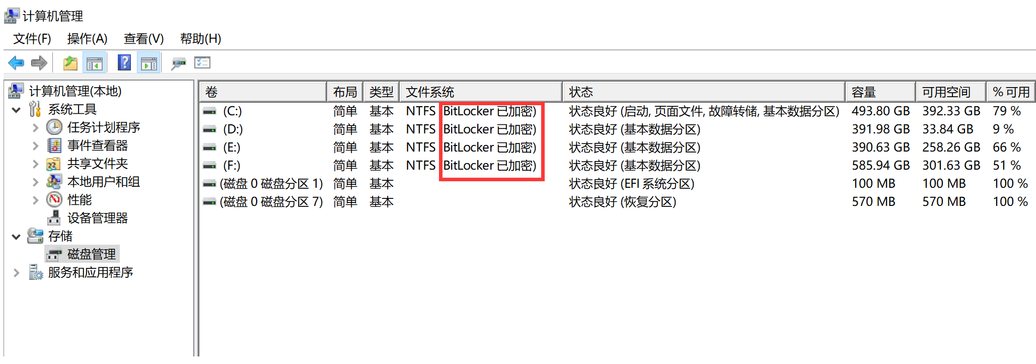 磁盤管理里面的磁盤帶有(Bitlocker 已加密)的標(biāo)識,這種情況也需要在設(shè)備加密里面關(guān)閉一下,關(guān)閉需要一定的時候解密,完成之后重啟電腦。