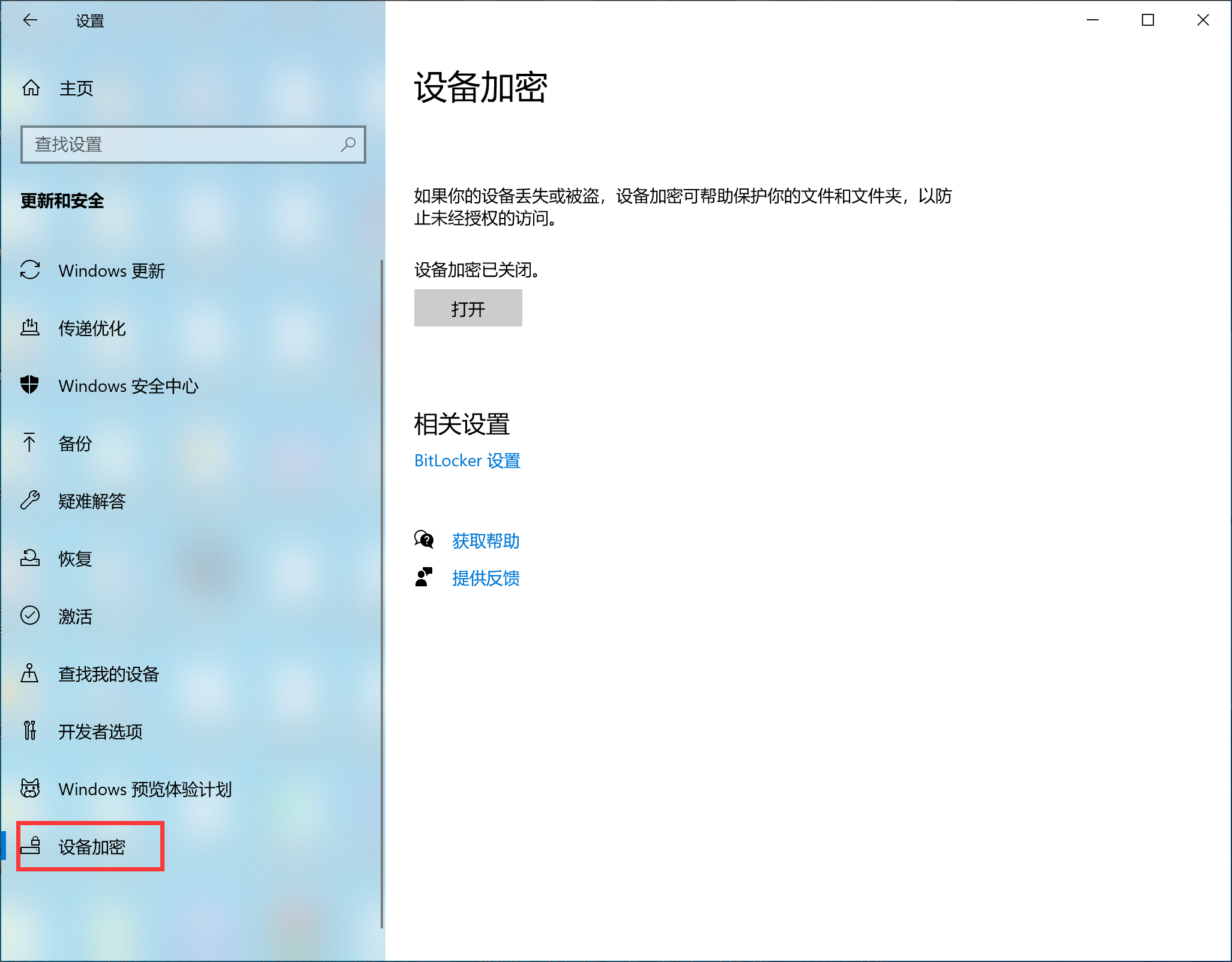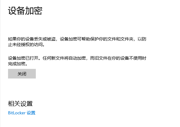 5、關(guān)閉設(shè)備加密功能后,設(shè)備加密欄位下方顯示 “設(shè)備加密已關(guān)閉”,若需要再次開啟此功能,只需要 點擊 【打開】即可。