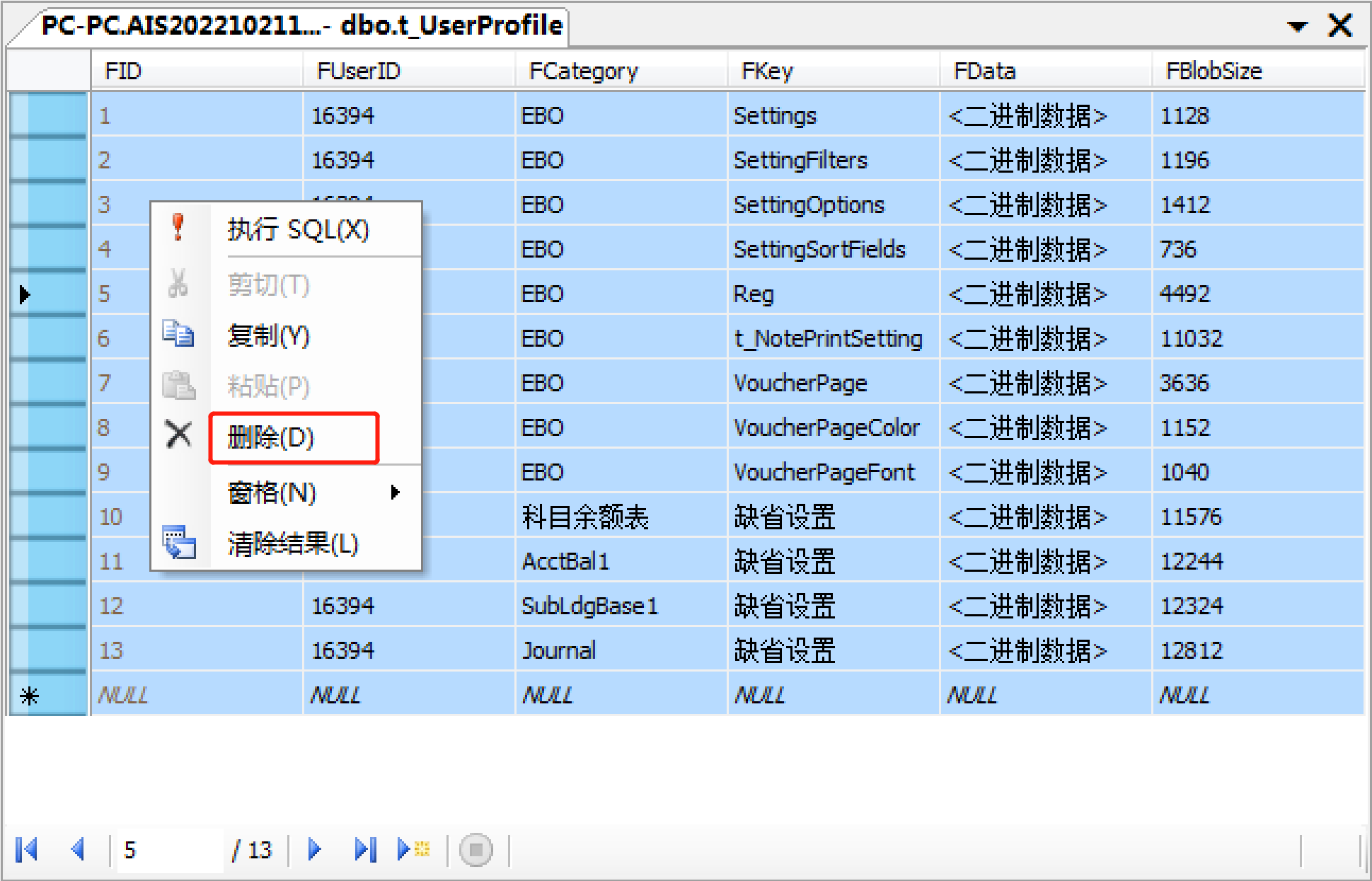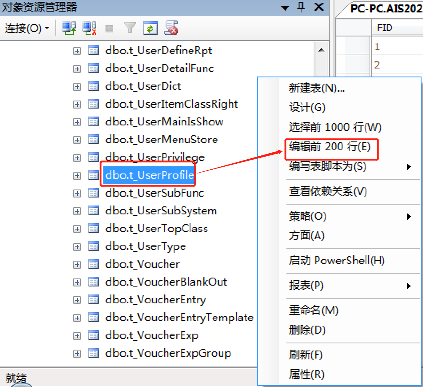 1、登錄數(shù)據(jù)庫,賬套——表——t_userprofile表——鼠標“右鍵”——編輯前200行;