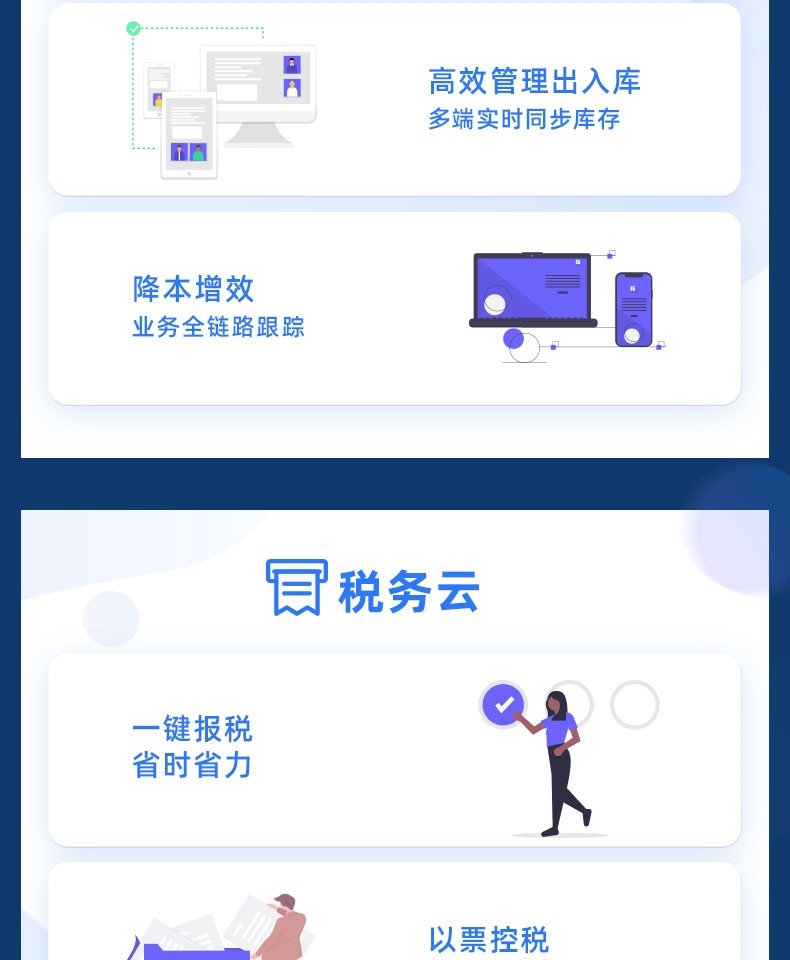 業(yè)財(cái)稅深度融合,智能核算,解放財(cái)務(wù)生產(chǎn)力,提升企業(yè)記賬效率;以票控稅,合理籌劃稅務(wù)申報(bào),幫助小微企業(yè)提升財(cái)務(wù)管理水平;