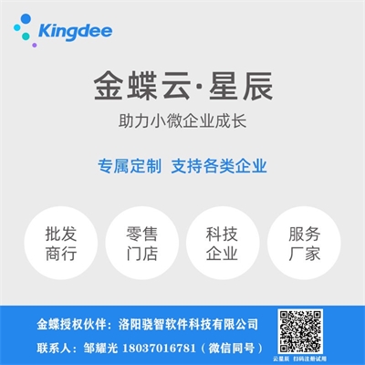 洛陽(yáng)金蝶軟件為中小微企業(yè)提供一站式企業(yè)ERP信息管理服務(wù),推出金蝶云ERP,精斗云系列:金蝶云會(huì)計(jì)、金蝶云進(jìn)銷(xiāo)存、云星辰、云電商、云訂貨、金蝶賬無(wú)憂(yōu);金蝶KIS云系列:KIS云專(zhuān)業(yè)版、KIS云旗艦版,咨詢(xún)電話(huà):18037016781(同微信)聯(lián)系人:鄒耀光。