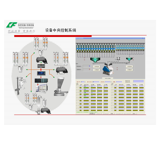 系統計量精度符合國家技術監督檢定規程電子料斗秤標準。生產過程中它可以按工藝流程要求,根據預定配方,對多種物料按固定比例重量值將物料加入稱重料斗內,當顯示的稱量值達到預設數值時(即完成每一種物料的稱重計量),再按照卸料程序將物料一次或分步多次卸入指定混合設備進行混合,以備成型或散料包裝。該微機自控系統具有設備全自動控制功能和稱重數據管理功能,可以記錄、打印配料數據。
